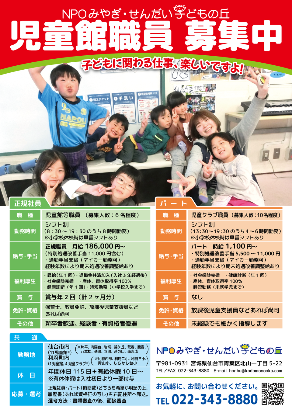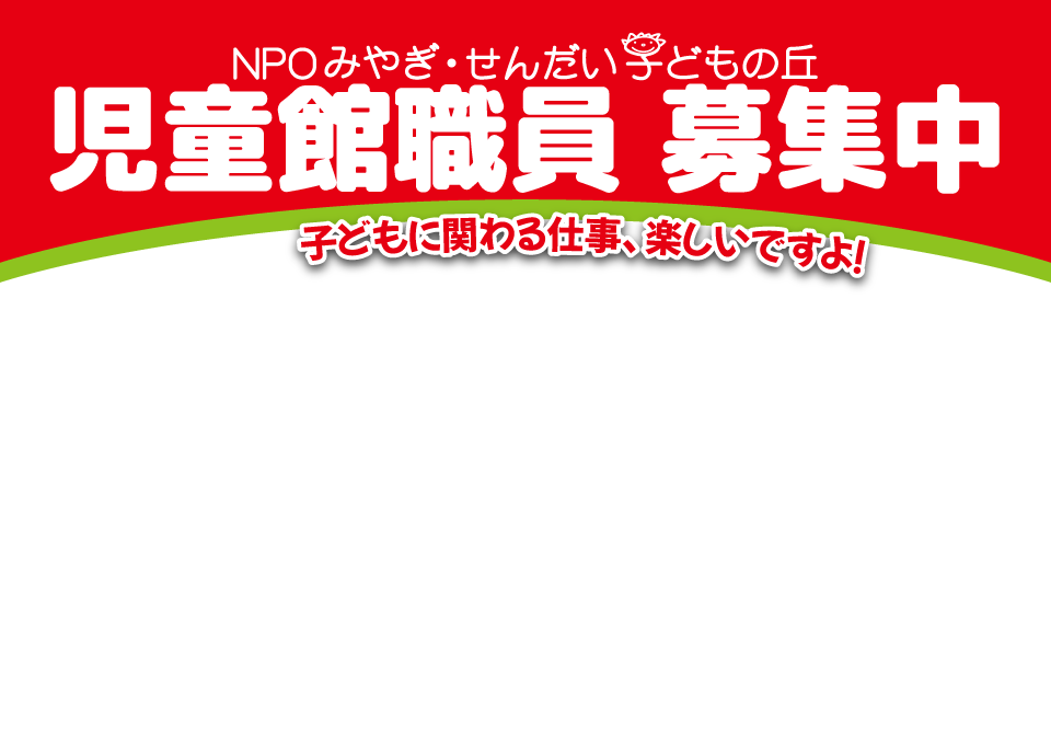 | 勤務地 | ●仙台市内(11児童館※) ※片平児童館、向陽台児童館、岩切児童館、錦ケ丘児童館、荒巻マイスクール児童館、鶴巻児童館、八本松児童館、通町児童館、立町マイスクール児童館、芦の口児童館、南吉成児童館 ●利府町内(1児童館、4児童クラブ※) ※利府西部児童館、利府二小児童クラブ、利府三小児童クラブ、青山小児童クラブ、しらかし台小児童クラブ |